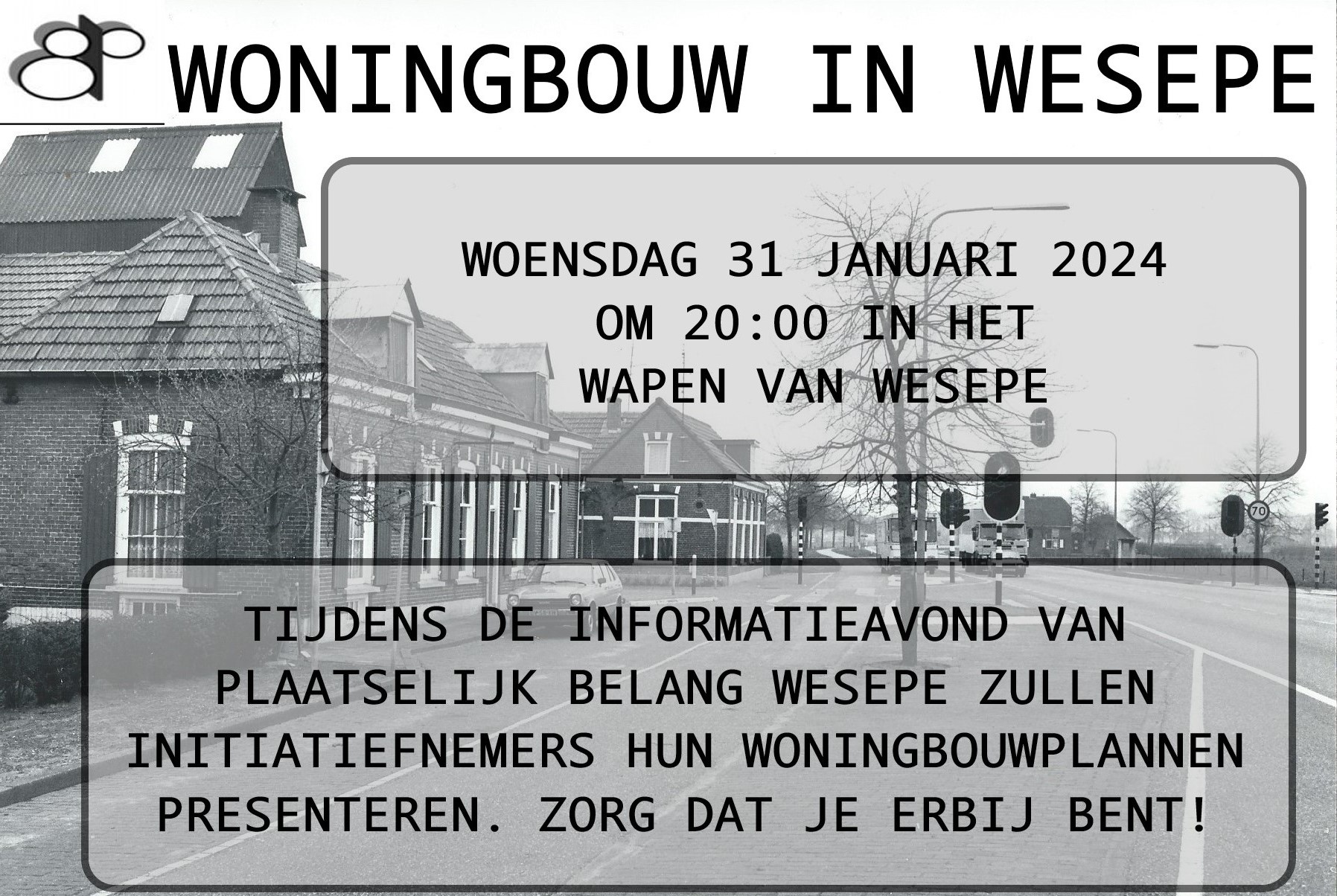 De jaarvergadering van Plaatselijk Belang Wesepe is op woensdag 31 januari om 20.00 uur in het Wapen van Wesepe. Het officiële gedeelte wordt kort gehouden en na een korte pauze zal de avond geheel in het teken staan van aanstaande Woningbouw in Wesepe.