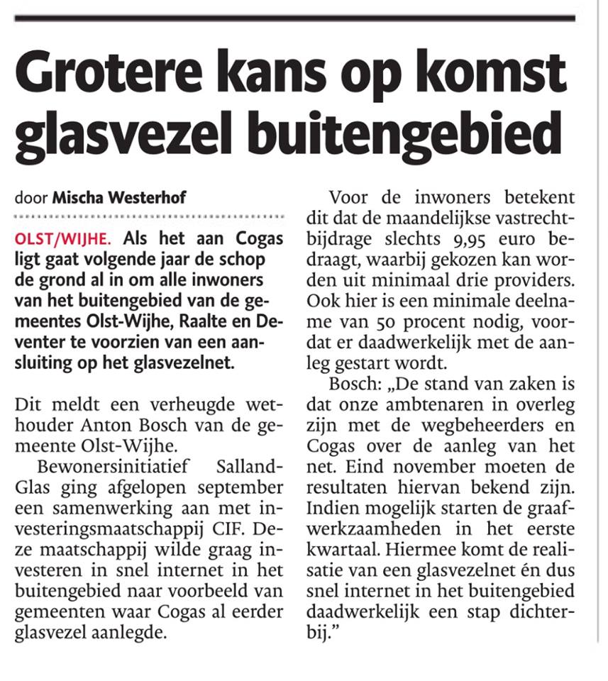 SallandGlas wil gebruikmaken van het aanbod van CIF om het buitengebied van Salland te voorzien van supersnel internet. De ruim 6.000 huishoudens op afgelegen plekken kunnen daardoor eenzelfde aanbod krijgen als in het aangrenzende glasvezelgebied dat is uitgerold door Cogas. Dat werd vandaag bekend gemaakt door voorzitter Ben Nijboer van SallandGlas.