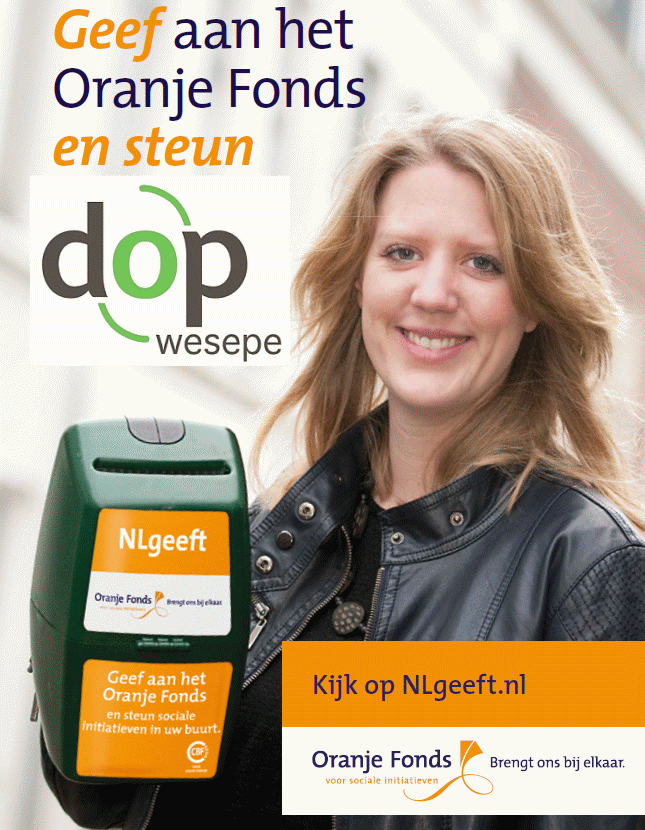DOP-WesepeDe week voor Koningsdag, van 22 april t/m 26 april vindt de eerste Oranje Fonds Collecte plaats in de provincies Overijssel en Utrecht. Collectanten uit Wesepe komen bij u aan de deur om geld in te zamelen voor het sociale initiatief. De helft van de opbrengst gaat direct naar het Dorps Ontwikkelings Plan in Wesepe.