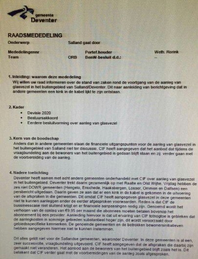 In de gemeente Deventer is naar aanleiding van berichtgeving over glasvezelnetwerken in andere delen van Overijsselin die verxschenen in onder andere dagblad de Stentor een raadsmededeling verspreid. Hierin kunt u lezen dat de aanleg van een glasvezelnetwerk in het buitengebied van Salland ongewijzigd doorgaat.